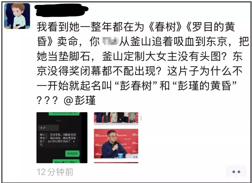 大V曝光的朋友圈原文如下:我看到她一整年都在为《春树》《罗目的黄昏》卖命,你从釜山追着吸血到东京,把她当垫脚石,釜山定制大女主没有头图?东京没得奖闭幕都不配出现?这片子为什么不开始就起名叫“彭春树”和“彭瑾的黄昏”?