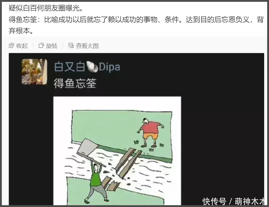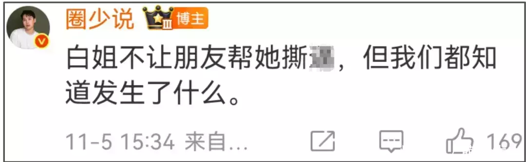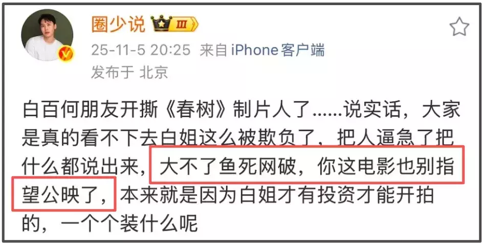 一位名为“圈少说”的百万粉丝大V放出疑似白百何好友朋友圈截图,令人意外的是,对方没有点名王传君,更没有提及争奖风波另一位主角文晏,而是直接炮轰《春树》制片人彭瑾,指责对方追着白百何“吸血”。