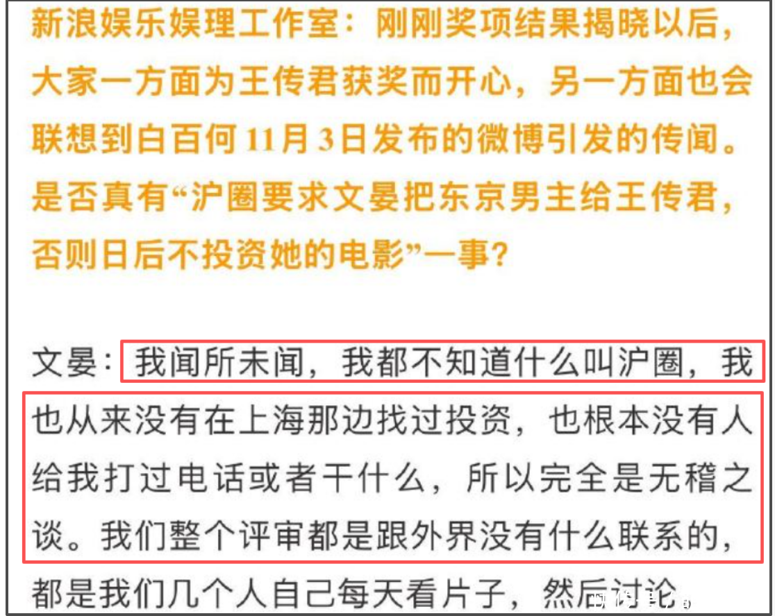 目前,评委之一的文晏接受采访,否认了沪圈之说,表示自己不认识白百何,也没有拉过上海那边的投资。对于白百何知道结果,她认为是剧照召回时泄露。