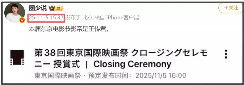 很快,还有眼尖的网友发现,原来白百何之所以在颁奖礼之前回国,是被通知不用出席东京电影节闭幕式了。